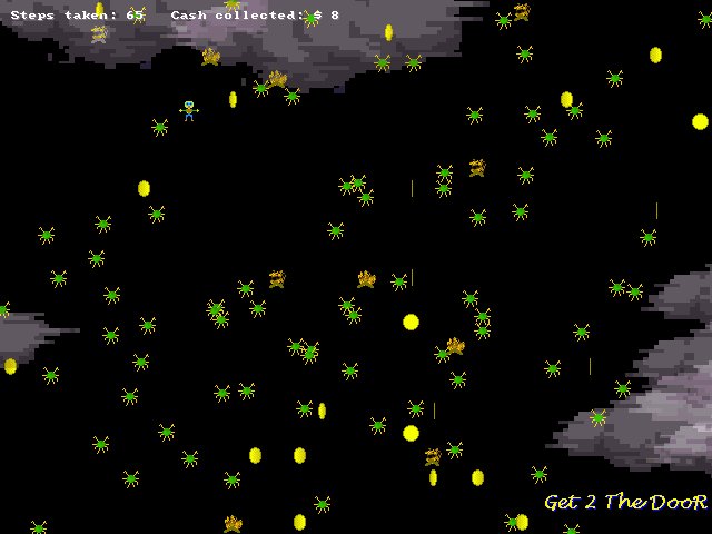 Project Status: Completed Links: Web Site Category: Arcade Developers: Kristoffer Relling Ports: DOS Source Code: Available Author's Description: G2TD was my first game in DJGPP using Allegro. Your object is to run around collecting money and avoid enemies such as hungry spiders and fire-places... Everytime you select START GAME the game creates a new level. Simple, but offers some fun! Downloads